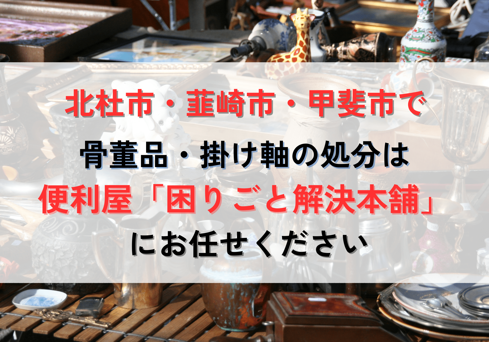 北杜市で骨董品や掛け軸の処分にお困りの方は、便利屋「困りごと解決本舗」におまかせください。処分費用は1,100円から対応いたします。お見積もりは無料ですのでお気軽にご相談ください。