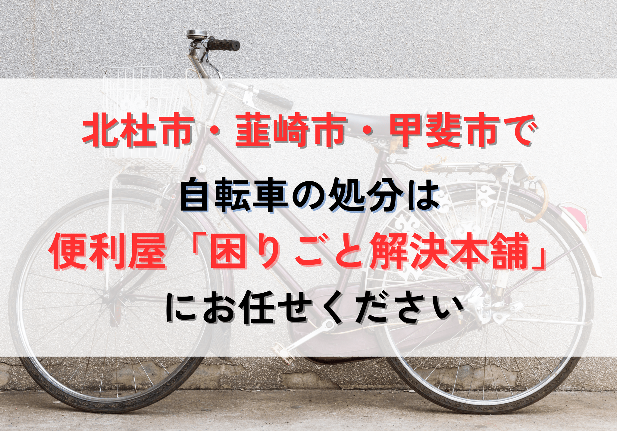 北杜市で自転車の処分にお困りの方は、便利屋「困りごと解決本舗」におまかせください。処分費用は2,500円から対応いたします。