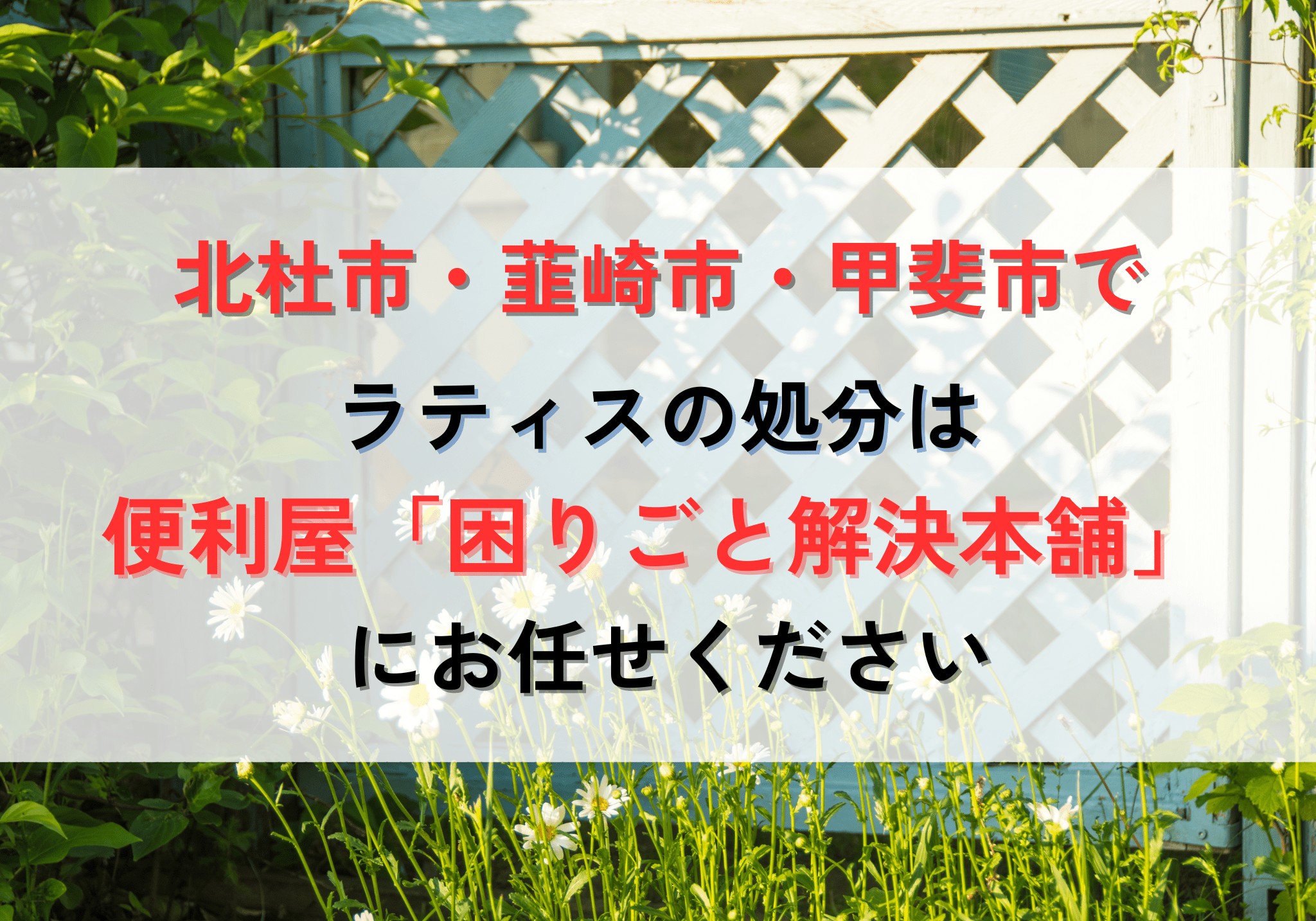 北杜市でラティスの処分にお困りの方は、便利屋「困りごと解決本舗」におまかせください。作業費用は3,300円から対応しています。お見積もりは無料ですので、お気軽にご相談ください。