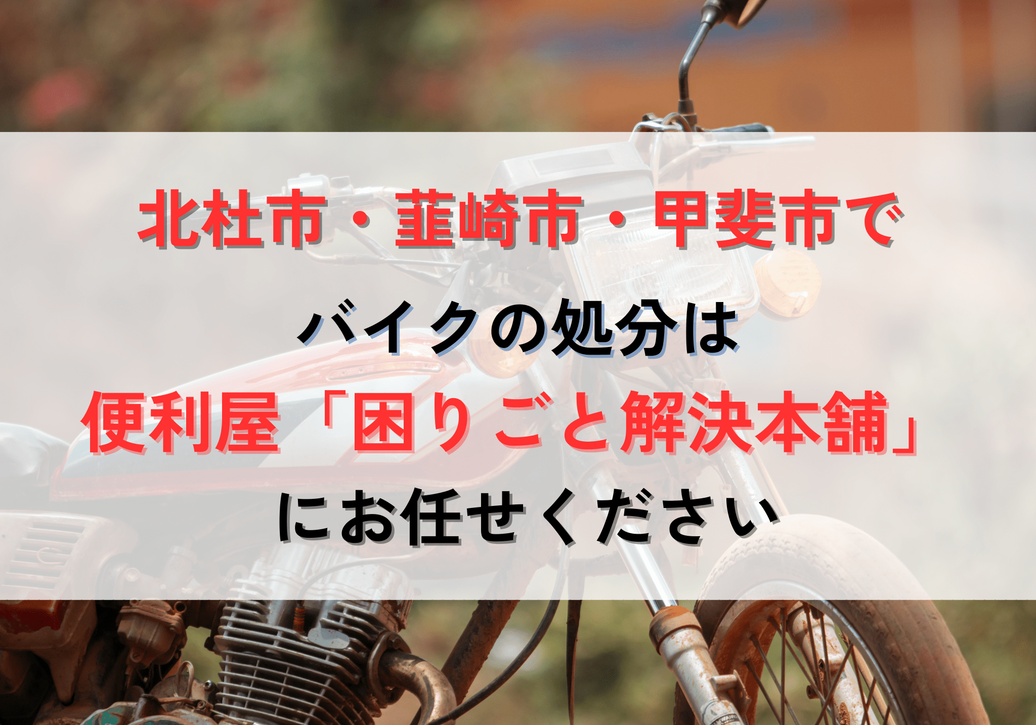 北杜市でバイクの処分にお困りの方は、便利屋「困りごと解決本舗」へおまかせください。処分費用は8,000円から対応いたします。お見積もりは無料ですのでお気軽にご相談ください。