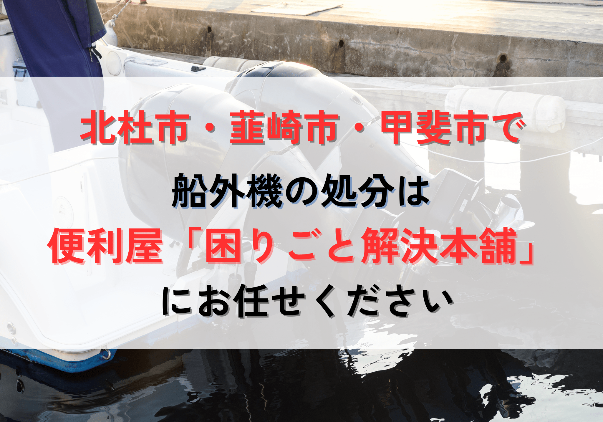 北杜市で船外機の処分にお困りの方は、便利屋「困りごと解決本舗」におまかせください。大きさや搬出環境などにより費用は異なります。