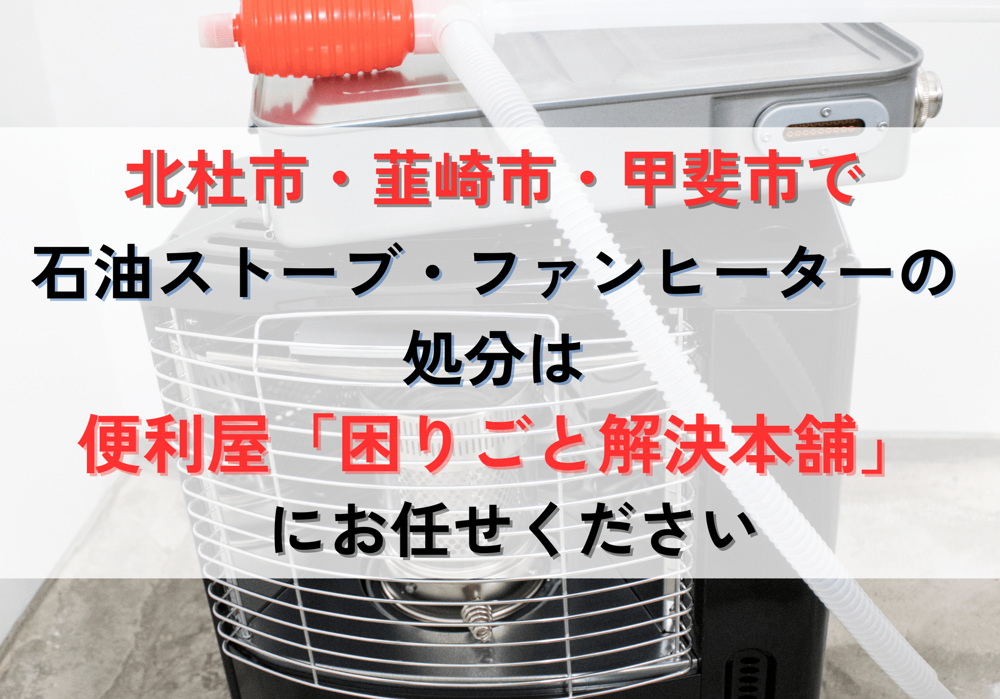 北杜市で石油ストーブやファンヒーターの処分にお困りの方は、便利屋「困りごと解決本舗」におまかせください。処分費用は3,300円から対応いたします。