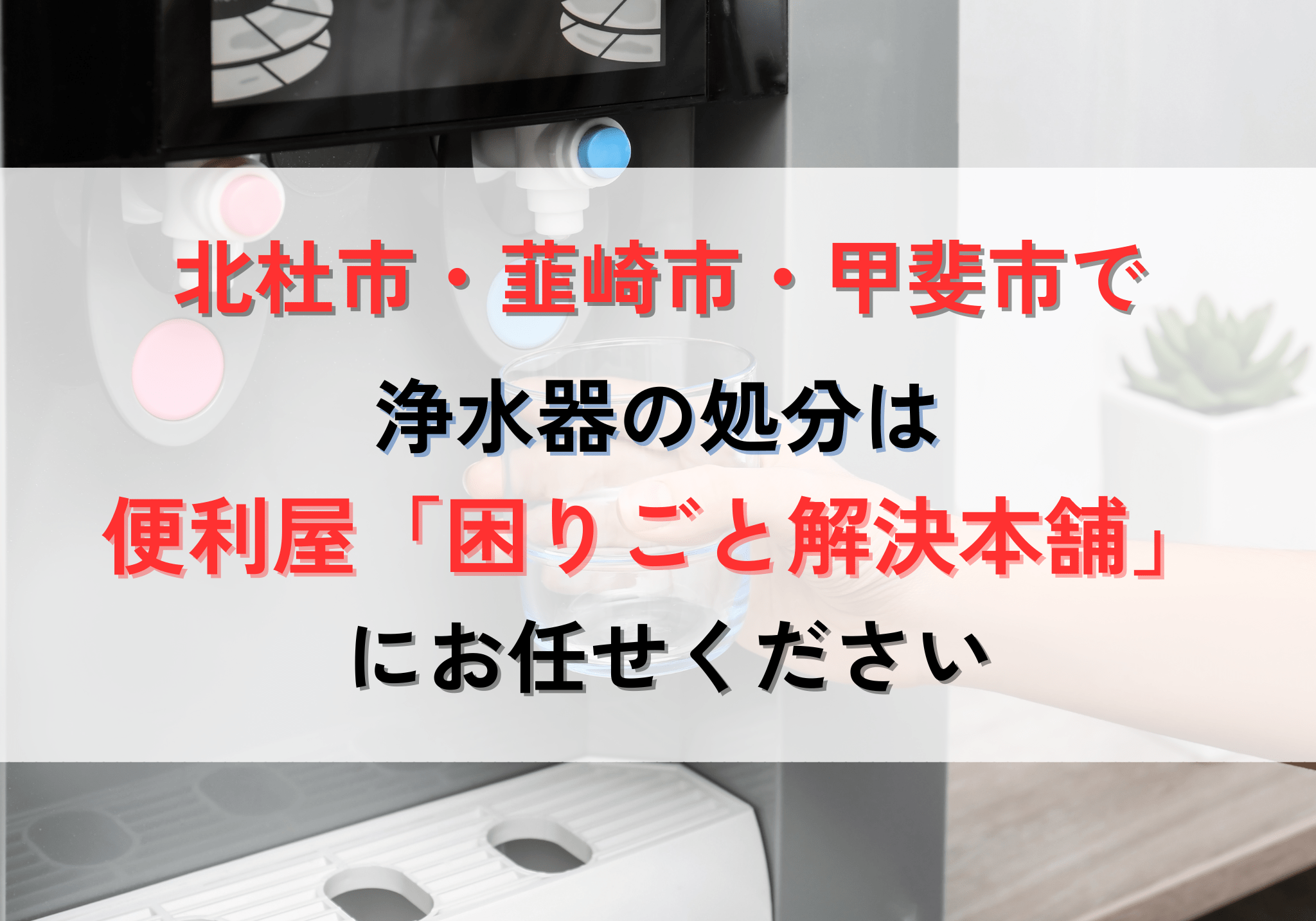 北杜市で浄水器の処分にお困りの方は、便利屋「困りごと解決本舗」におまかせください。処分費用は3,300円から対応可能です。お見積もりは無料ですのでお気軽にご連絡ください。